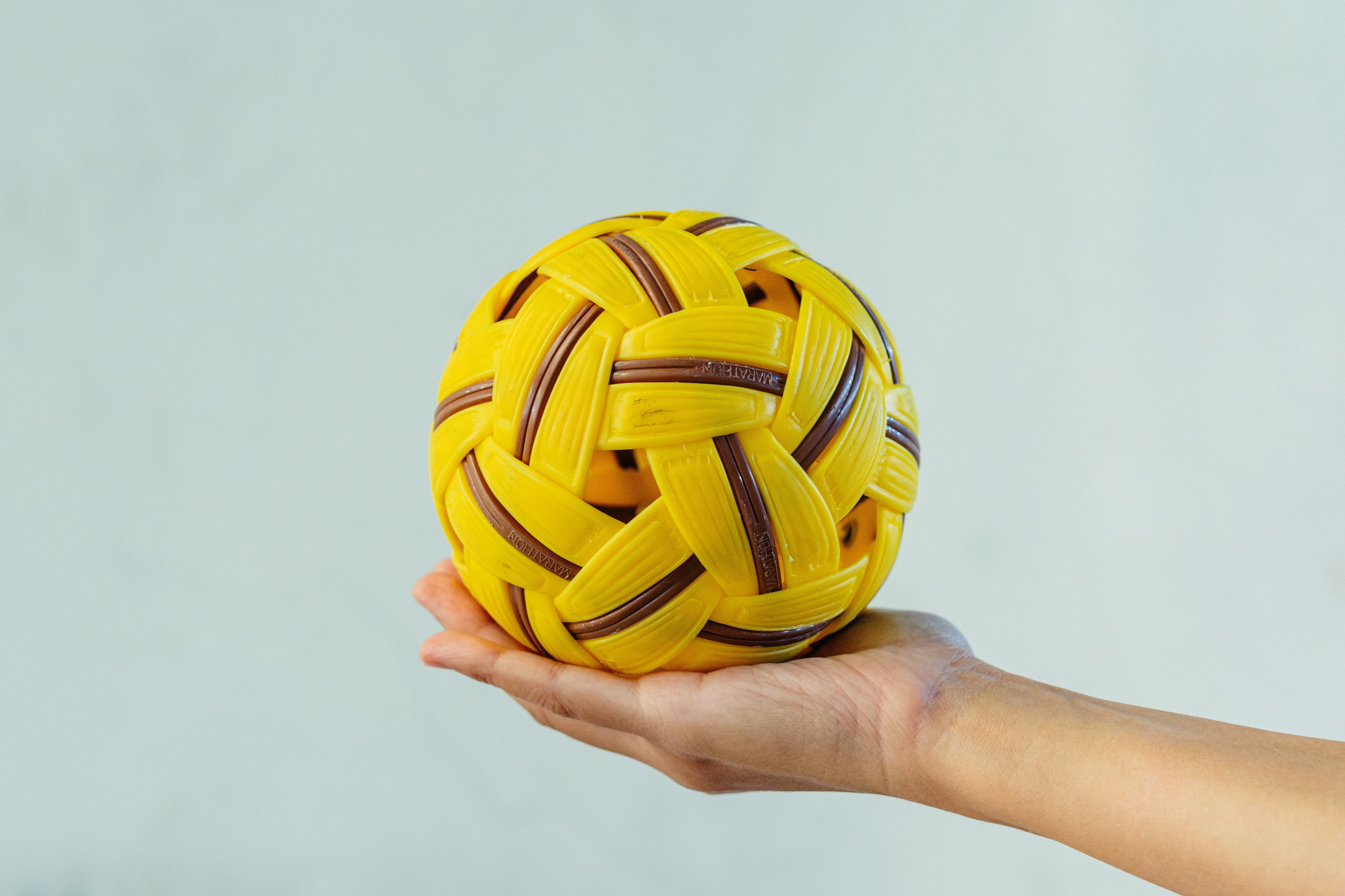 傳統藤球是由藤條編織而成,現代改為合成纖維代替