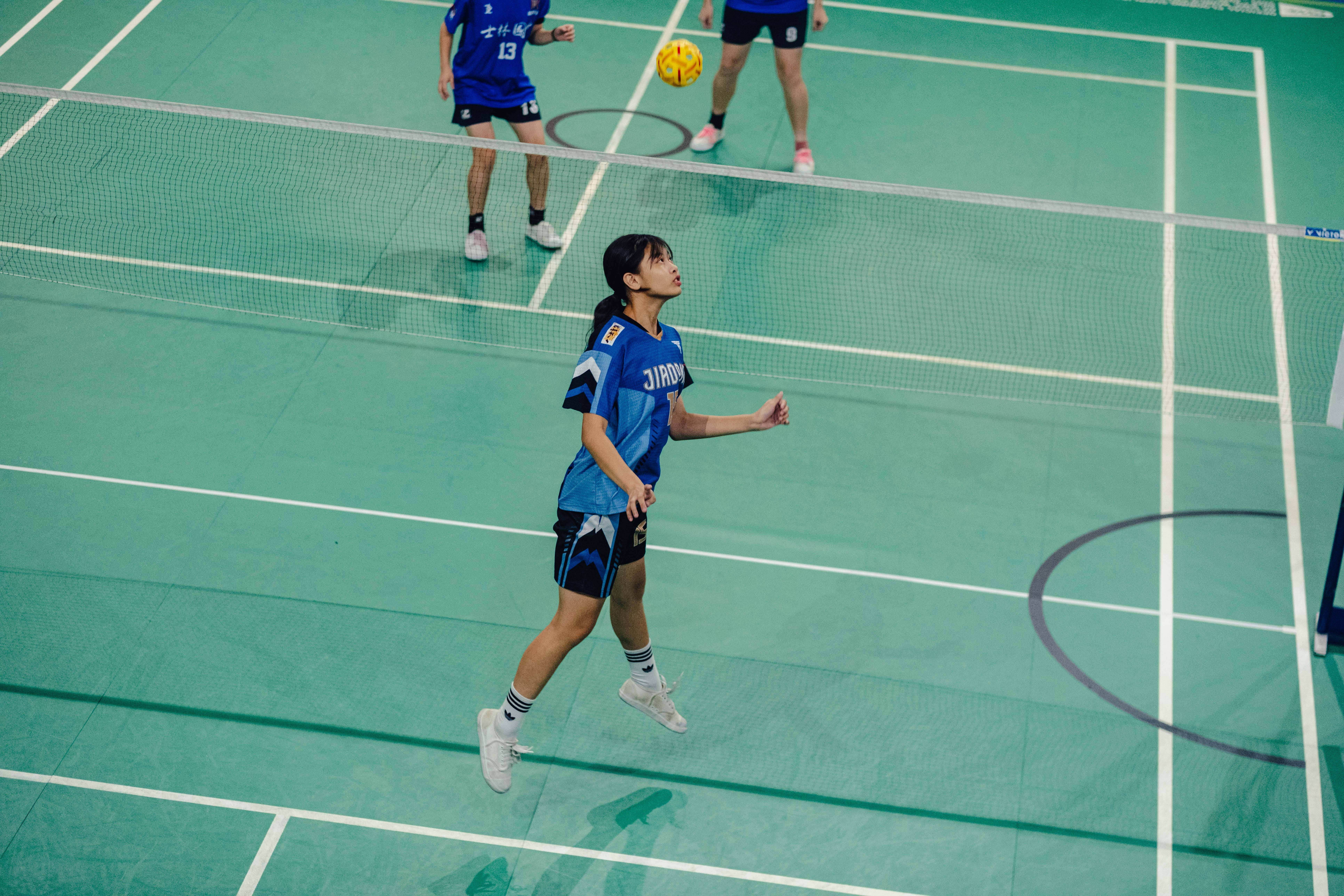 在訓練方面,藤球分為技術與體能兩大重點。技術上,晨間訓練會以足內側、腳背、大腿和頭頂等基礎控球為主;課後則進行專項訓練,包含攻擊手、做球手與發球手的個別練習,以及組織戰術演練。體能部分,透過繩梯步伐、極速折返跑、側移、跳躍與核心訓練來強化身體條件。藤球較其他球類運動的獨特之處,是訓練上會使用懸吊定位球進行練習,將球懸吊在約2.5公尺高處,讓攻擊手練跳躍踢球,發球手練抬腳發球,進一步提升準確度。