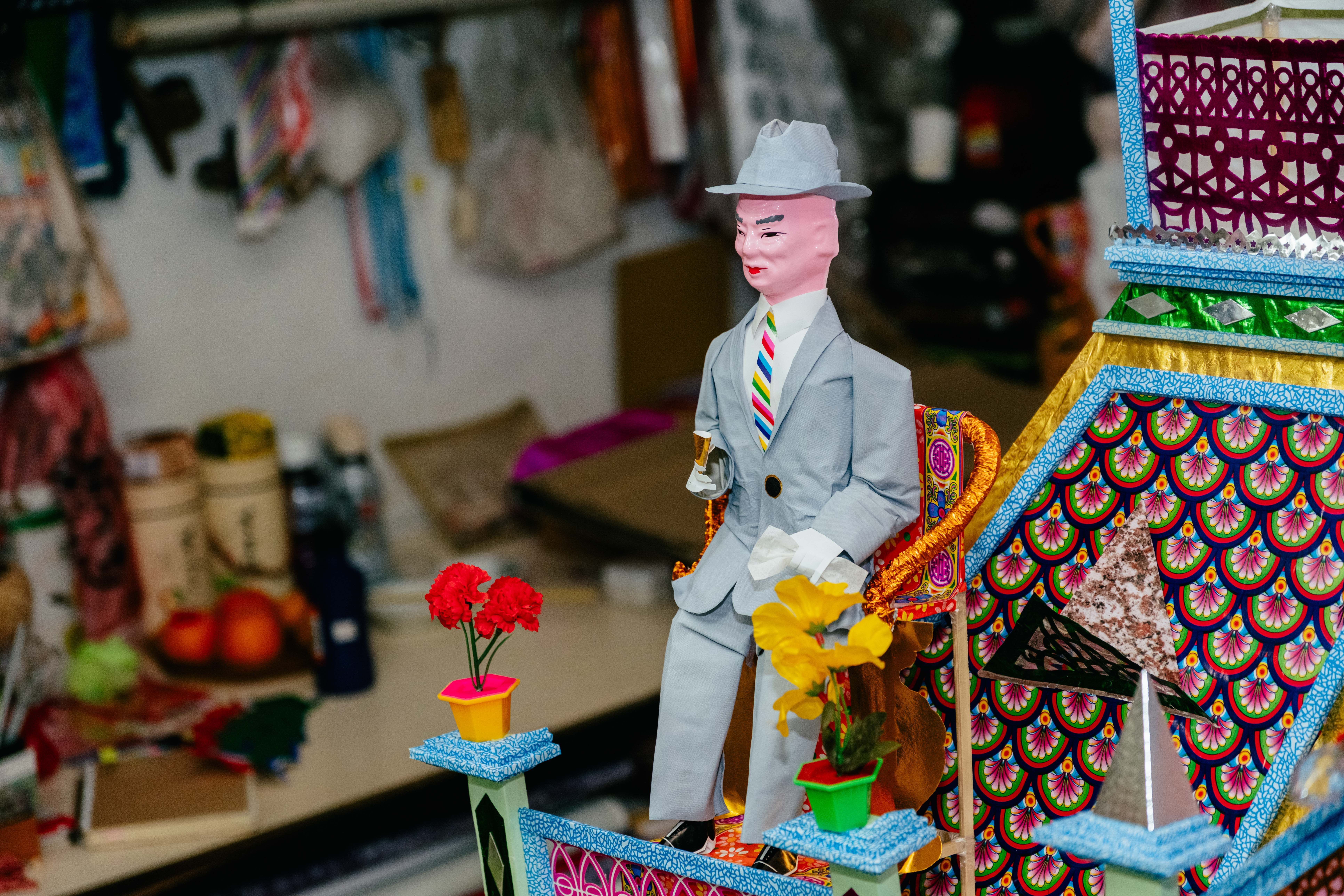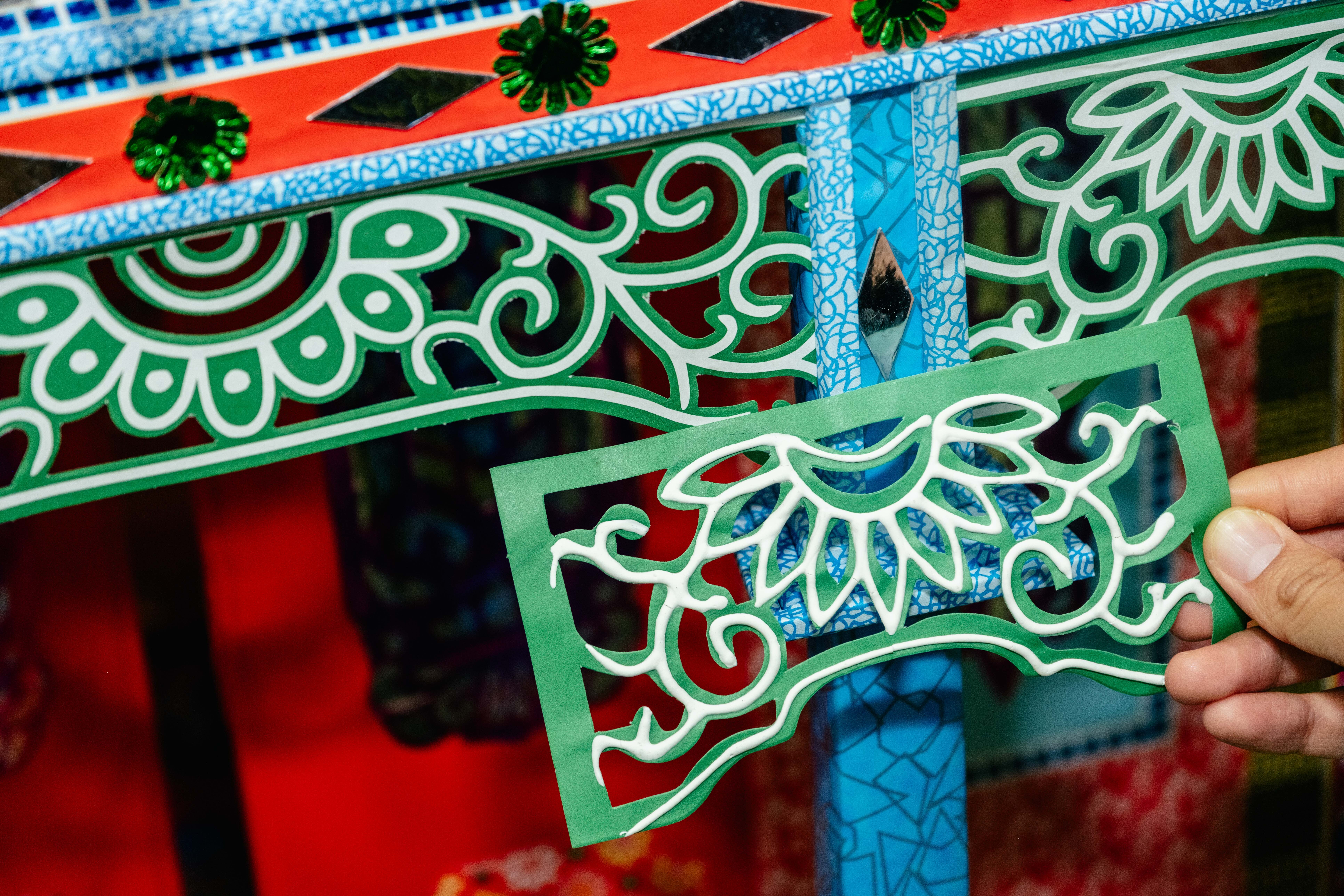 身為家族第四代,宛瑩表示早期糊紙產業是工班概念。從漢式主屋、圍牆護龍到動物人偶皆由不同師傅負責。接到案件之後,統籌負責詢問師傅們的檔期,由於大家學習同一套系統,即使各自作業,最後拼在一起也毫不違和。「漢式建築分為前落與後落,師傅之間多半只需協調地板顏色,空間即可自然銜接。」