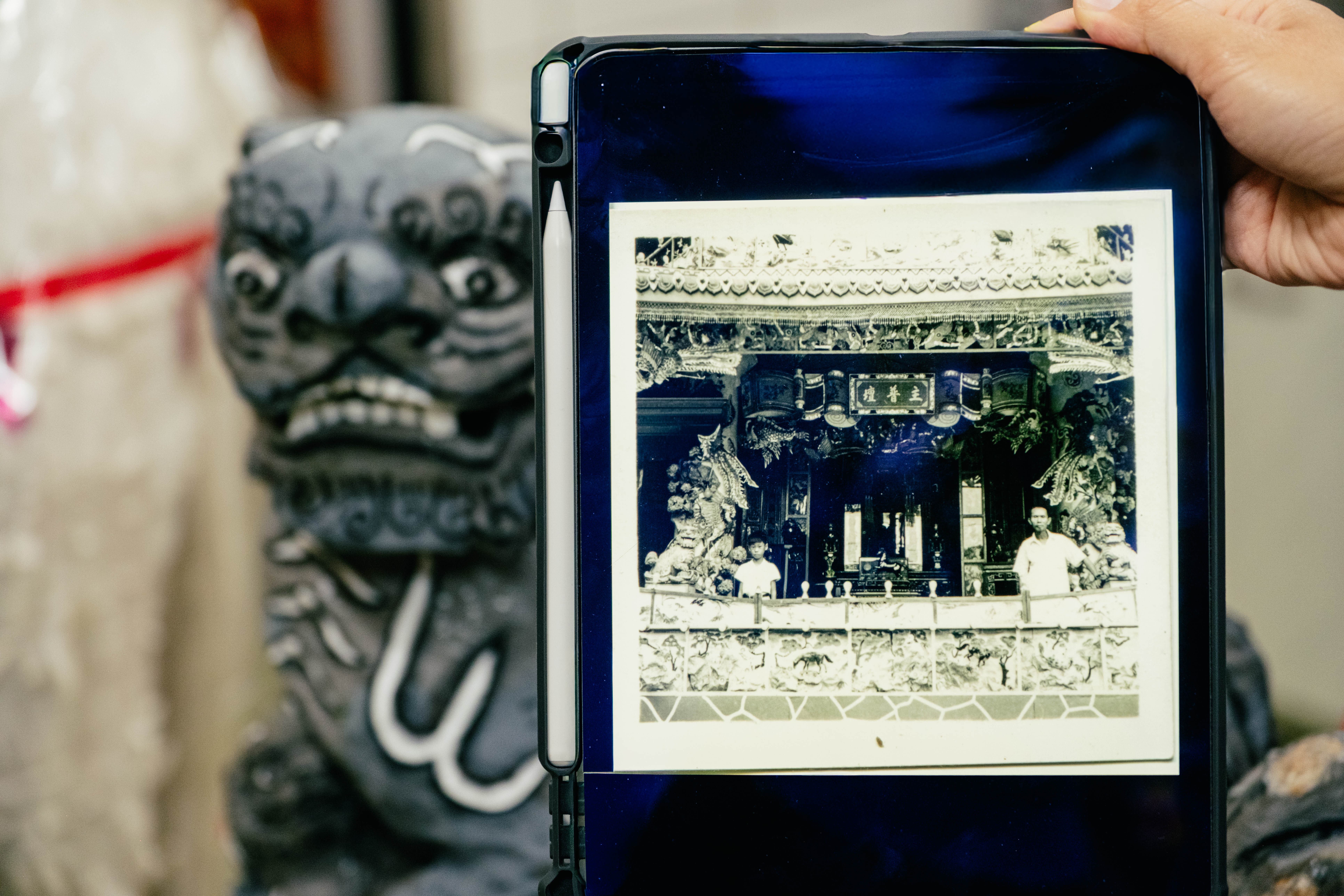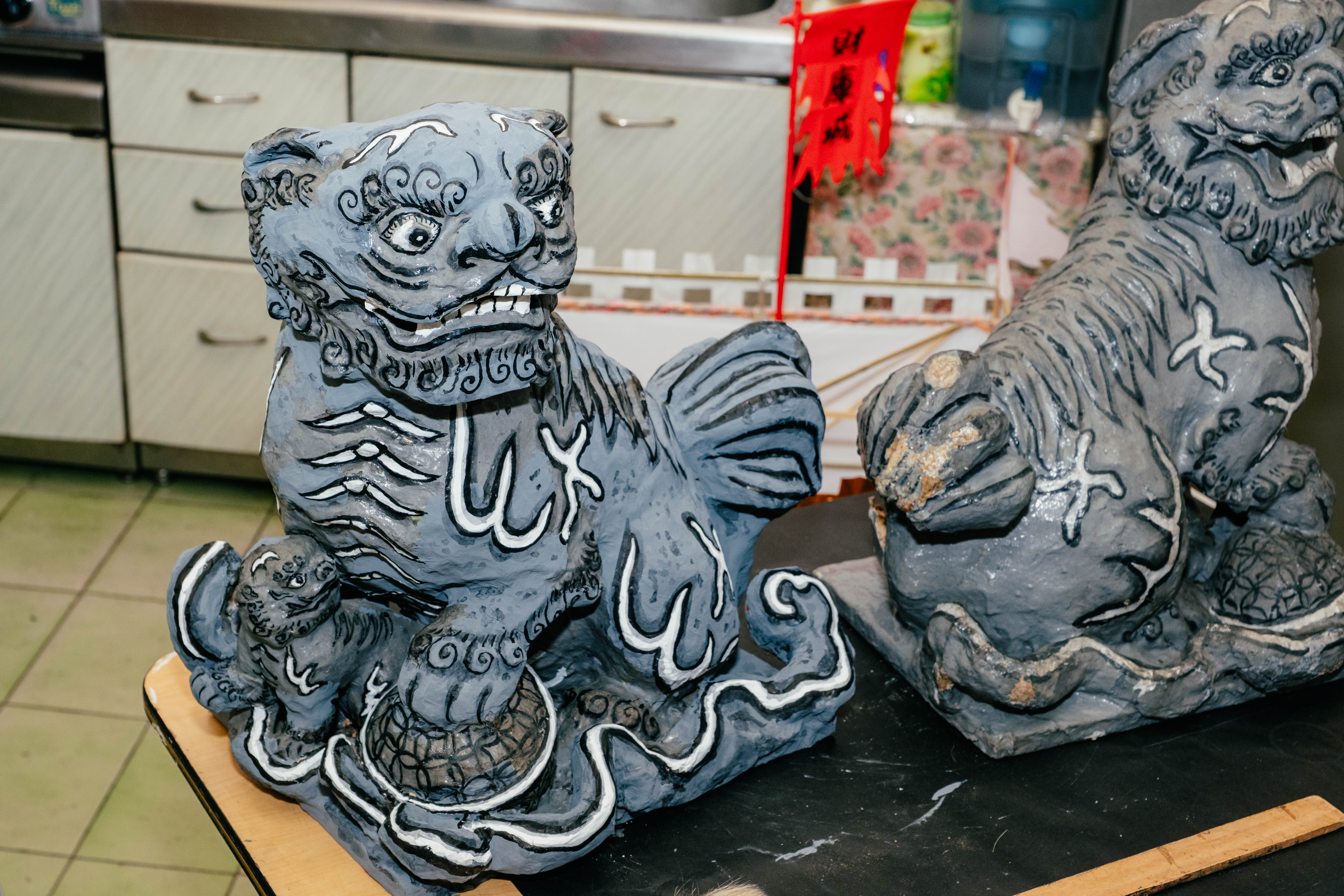 能夠獨立製作大士爺,是宛瑩正式踏入這門工藝的重要里程。家中持續承接紅白事製作,農曆七月前為旺季,需完成三、四十尊大士爺。同時宛瑩也投入舊作修復,工作室放著一對逾八十年的紙糊石獅,是第一代用於建築裝飾的作品,近期恰好在修補毀損。她拿出家族老照片,還有父親童年與石獅合影的影像。過往修復多是整層覆蓋重畫,宛瑩改以仔細清除髒污,局部修補上色,保留歲月痕跡。