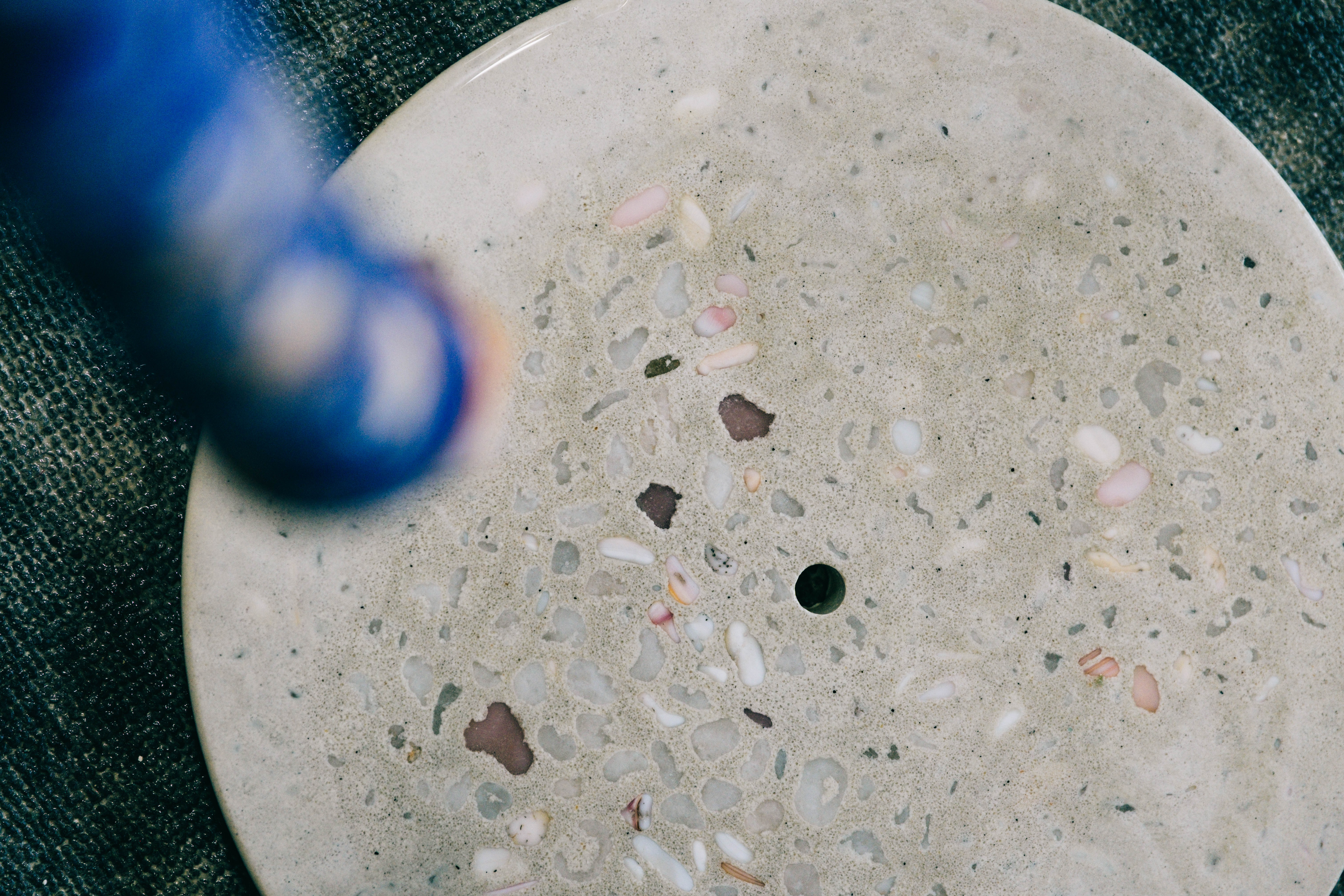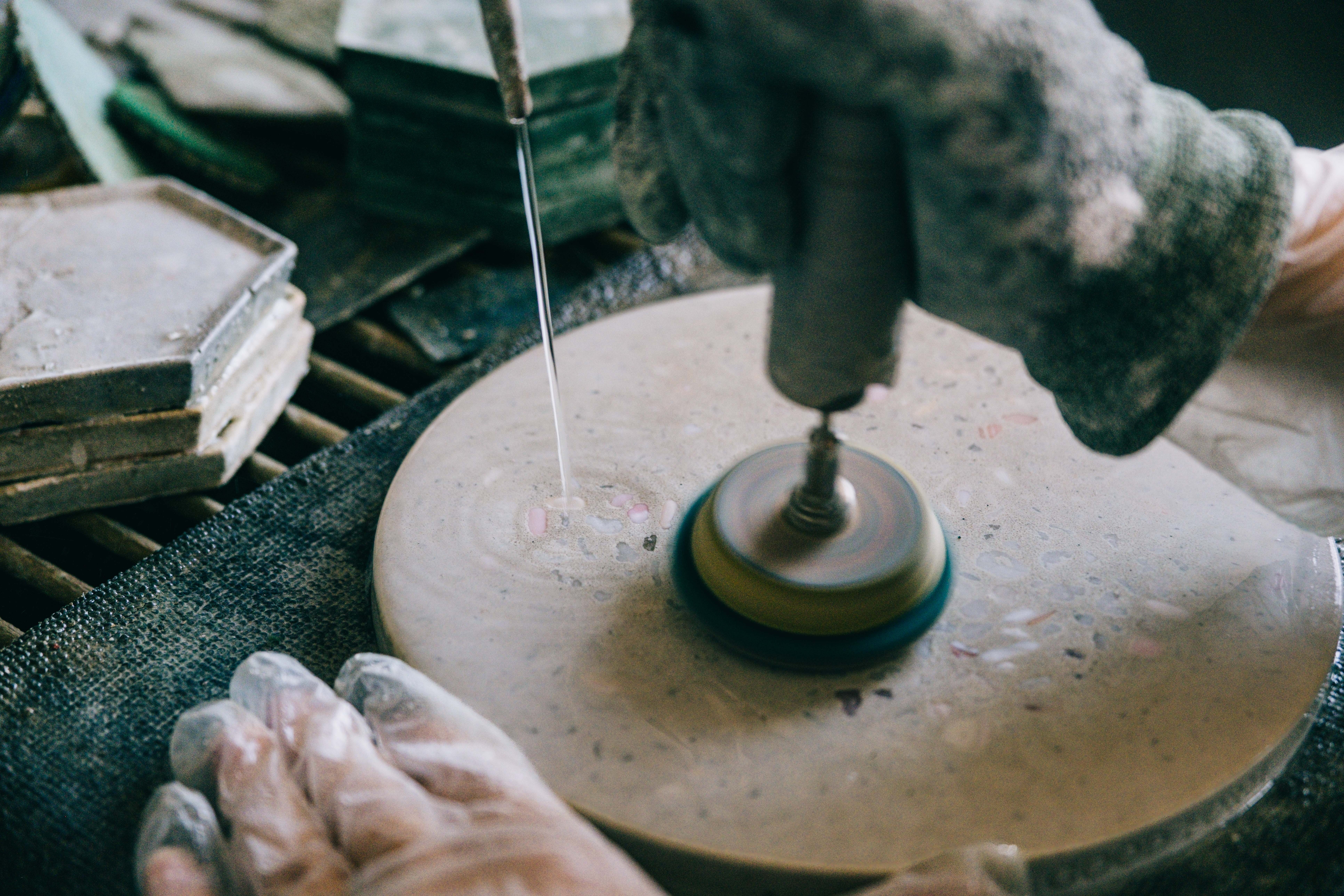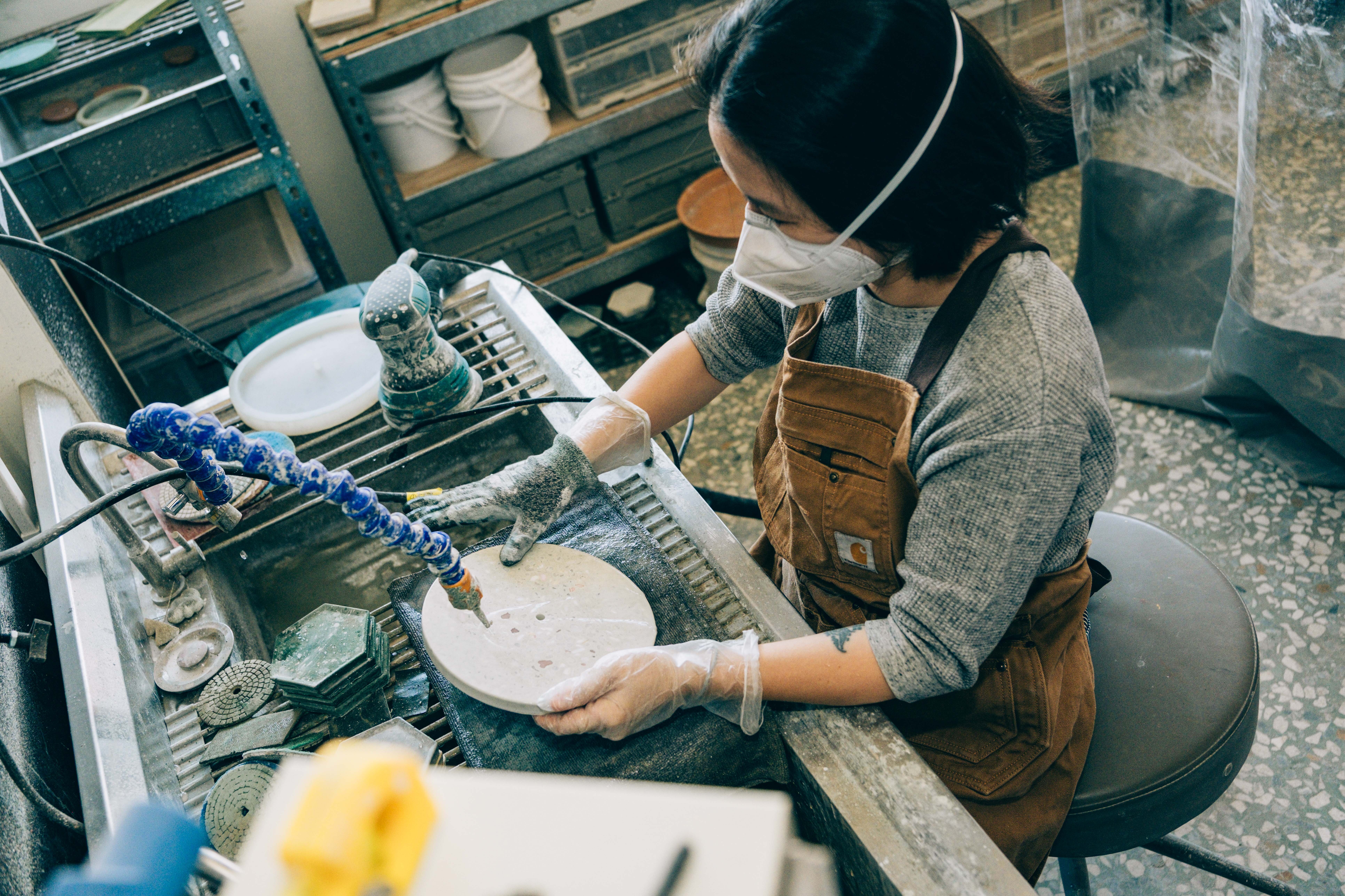 工作室牆上掛著彩色研磨片,瓶瓶罐罐的色粉陳列。雨蘭戴著口罩,手持圓盤砂紙機,水緩緩地滴落在石面上。雖然工業用吸塵器會把粉塵吸進一旁的大型集塵桶,四周還是被細微粉塵肆意沾黏檯面。旗下的手作器物,在繁雜的淘洗工序與塵霧之中,最終磨出石材的平整光澤。