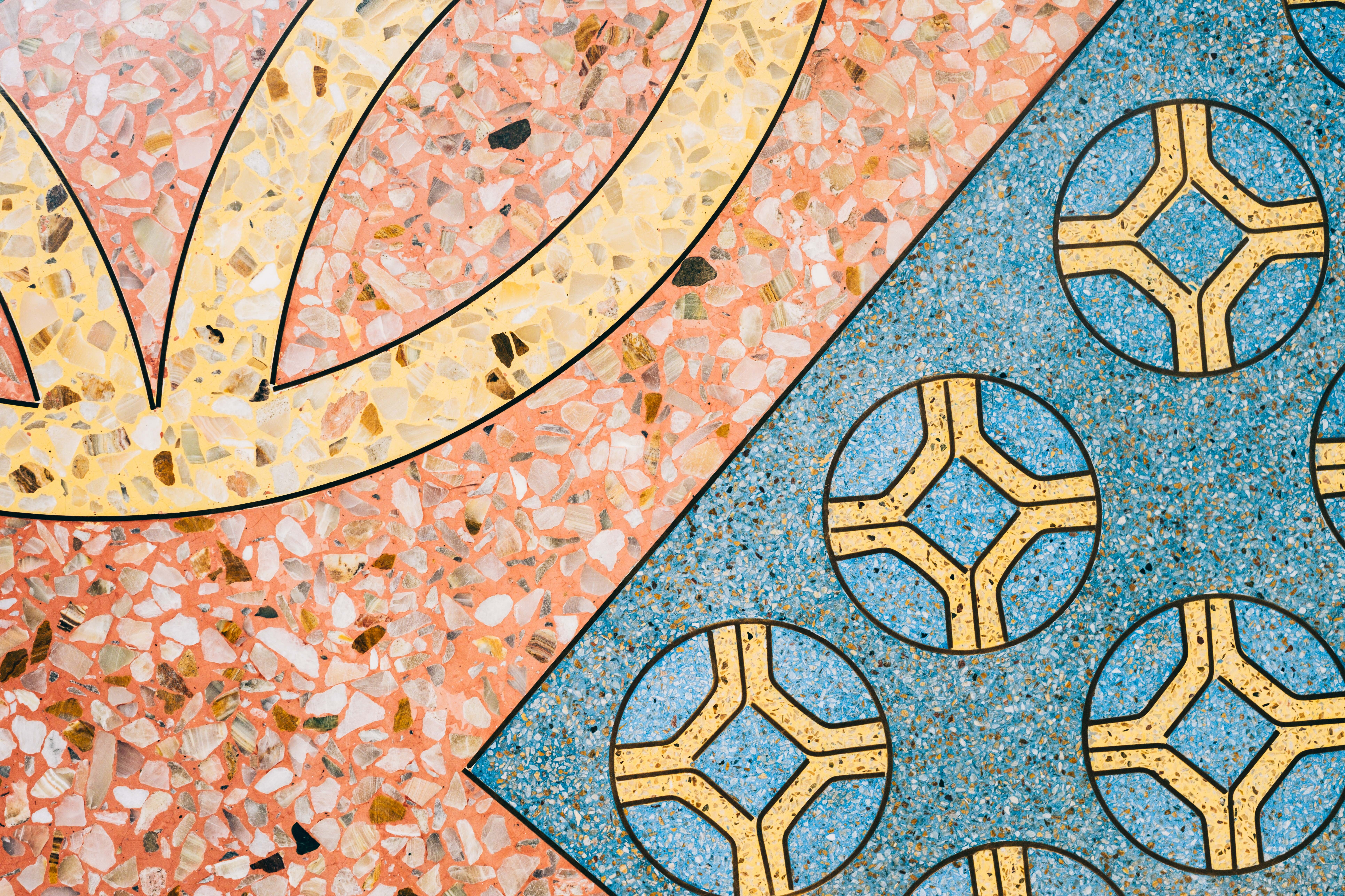 如何在填充材料的選擇與配色和諧共存是表現美感的細節。雨蘭分享早年私宅的磨石子地板有些會加入紅磚或彈珠跳色,海線的廟宇常見貝殼混入;經濟能力允許的話,有人會混入玉石。Good Form從傳統延伸出當代感,水泥灌模製成時鐘、杯墊、置物皿和線香座等;更以台灣小吃成為色彩靈感,例如牛軋糖、棉花糖、鹹酥雞和碗粿命名,對應各種色相組合。
