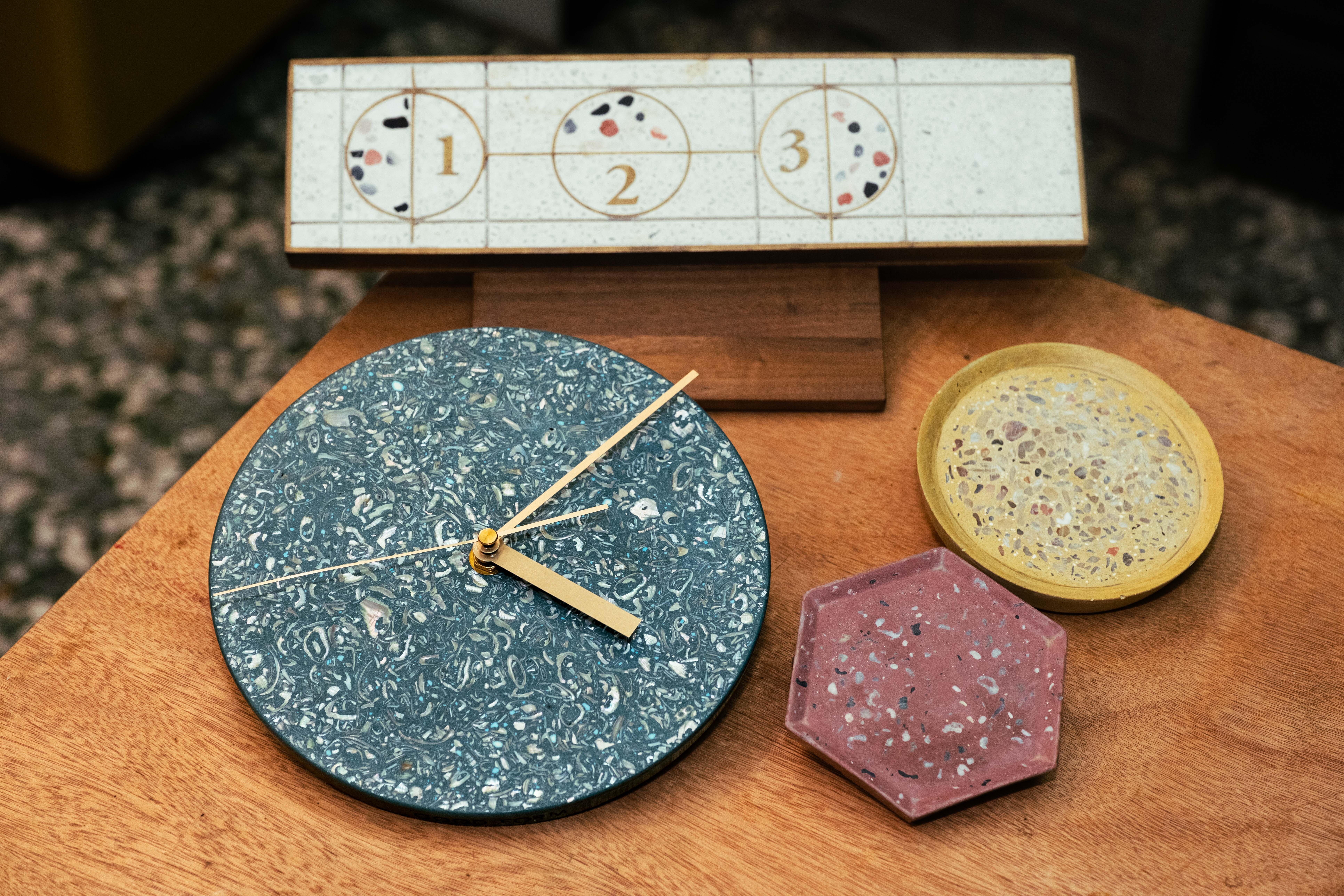 她笑說:「我這是體力活。」石材可以從石材行大量採購,有些是到花市或水族館尋找貝殼、彩石或玻璃。新穎的磨石子商品隨著雨蘭多年奔波於南北市集盡心推廣,所幸近年掀起了老屋復興風潮,年輕一代不會嫌棄磨石子老派,反而更能理解每塊磨石子都是職人用時間堆疊的心力。