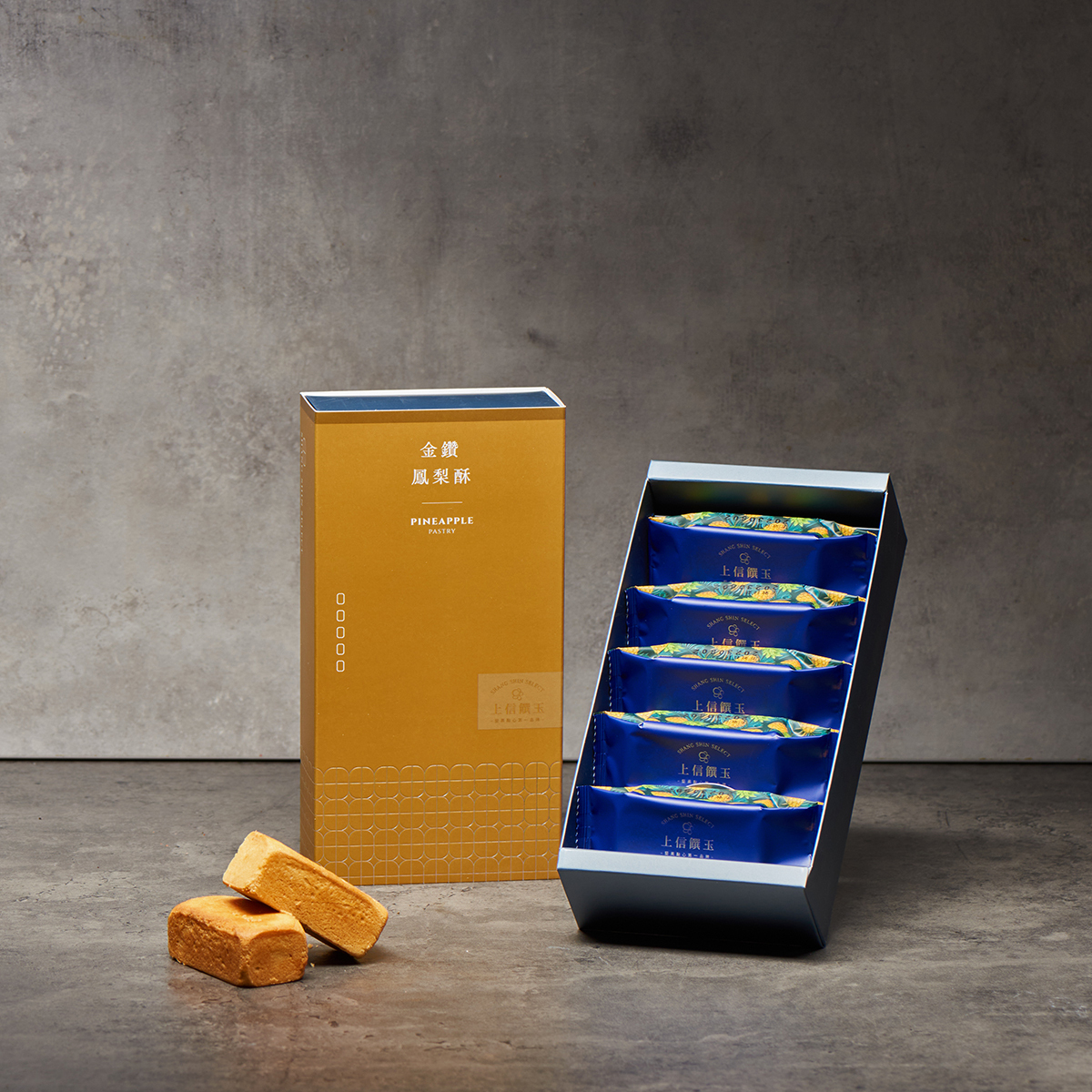 ▶ 特色:若想送給經商的親友或客戶端午節伴手禮,有諧音「旺」的鳳梨酥是許多人的送禮首選。上信饌玉除了堅果塔之外也有販售金鑽鳳梨酥,其鳳梨酥內餡使用台灣在地金鑽鳳梨製作,經巧心刨製成細絲,再經大火熬煮2-3小時,呈現微酸甘甜的完美口感。這款金鑽鳳梨酥融合了冬瓜餡的香甜,卻保留了鳳梨果肉纖維,深受兩派鳳梨酥愛好者的喜愛。