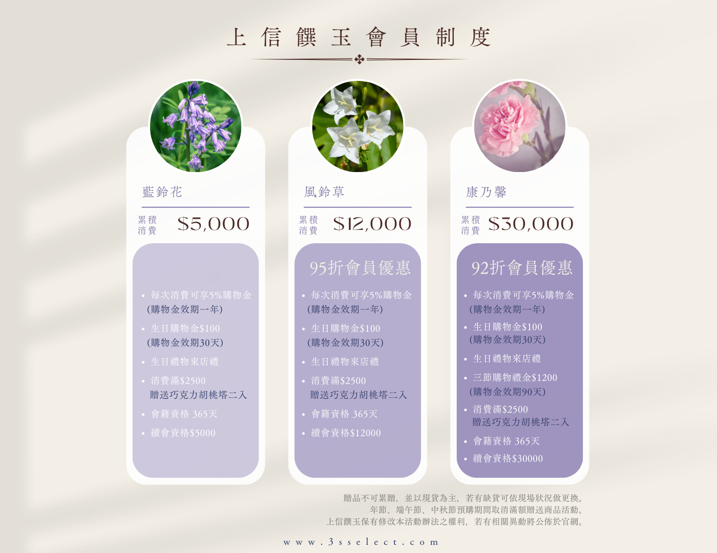 感謝您一直以來對上信饌玉的支持與厚愛!為了回饋您們的信賴,我們根據客戶的消費回饋進行了優化,提升了整體消費體驗。現在,累積消費達到藍鈴花、風鈴草或康乃馨等級,即可享受不同的尊榮待遇。調整細項以下列點說明: