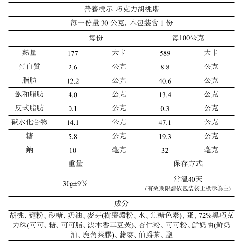 巧克力胡桃塔1入 (蛋奶素,常溫保存40天)