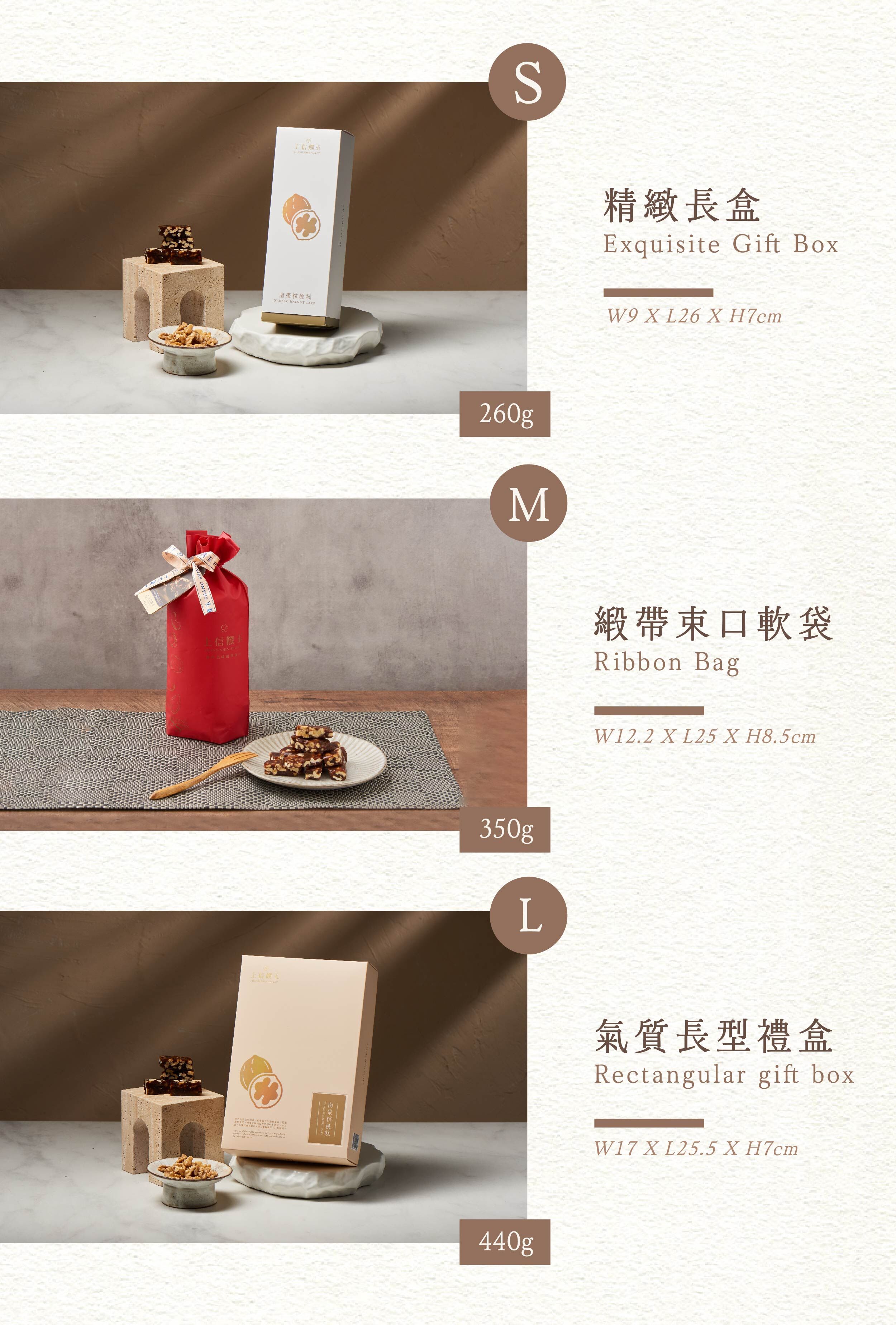 • 尺寸可於下方選項選擇:S-260g精緻長盒、M-350g緞帶束口軟袋、L-440g氣質長型禮盒