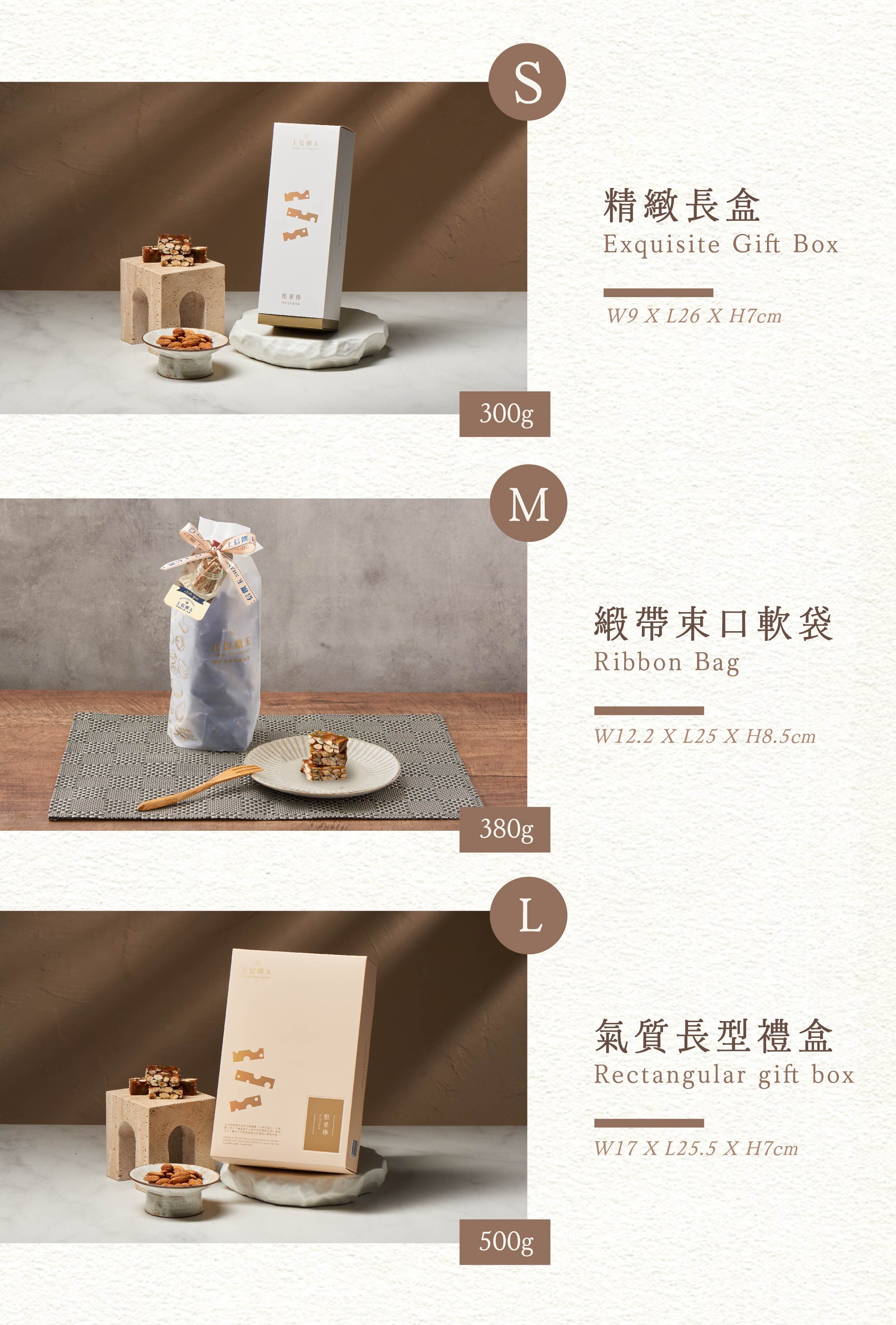• 尺寸可於下方選項選擇:S-300g精緻長盒、M-380g緞帶束口軟袋、L-500g氣質長型禮盒